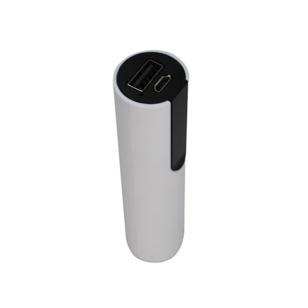 - Powerbank: Lithium battery 2600 mAh (3.6V) with USB-A output 5V/1A and charging input (probably Micro USB).